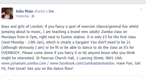 A school friend of mine, Julia Main, recently moved back from Italy. She posted on Facebook that she would be running some Zumba classes in a location pretty close to my office. As I’m looking for ways to get fit and Julia being a fellow Old Cranleighian (and 2Norther no less) I decided there and then that I was in.